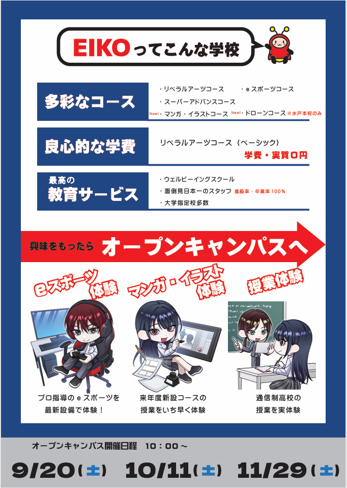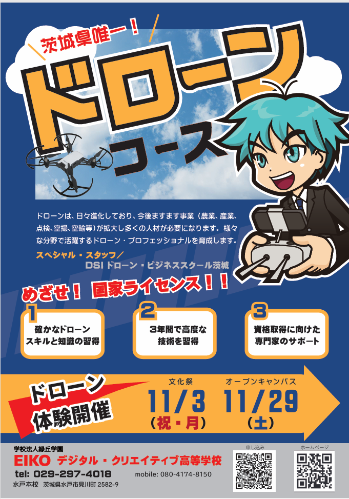 なお、11/3(月)のEIKO祭(文化祭)においてもドローン体験ができます。