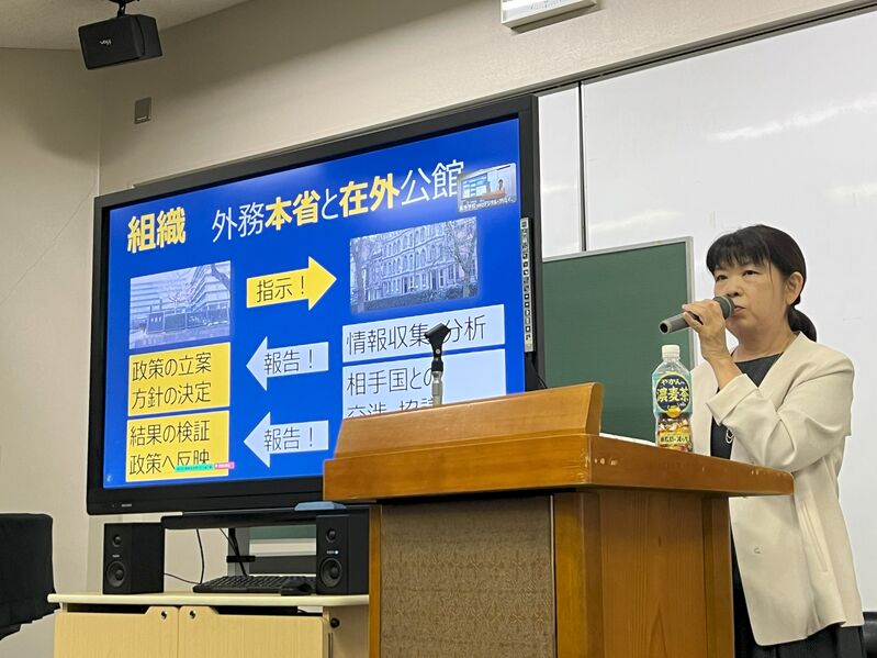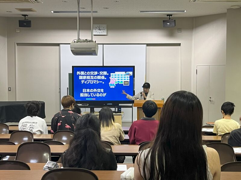 講座では、クイズを交えながら、外務省の役割や仕事内容、日本外交の5つの取り組みについて具体的に学びました。また、国際社会における発信力を高める取り組みであるパブリック・ディプロマシーについても解説していただきました。