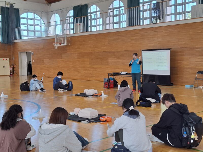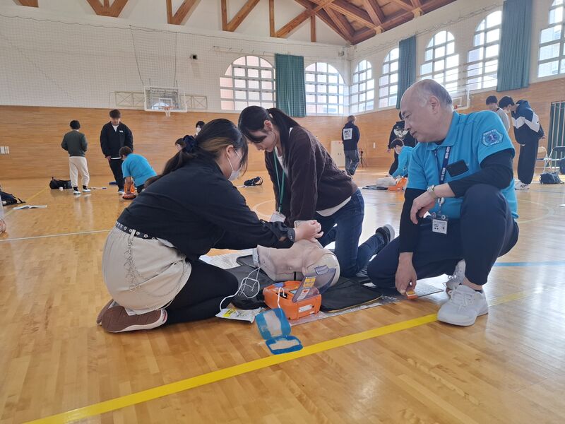 講義では、心肺蘇生やAEDの使い方について様々なポイントについて学びました。実際に人形を使用して心肺蘇生を行い、生徒からは、「思ったよりも力がいる」「ずっと続けるのは大変」といった感想がありました。