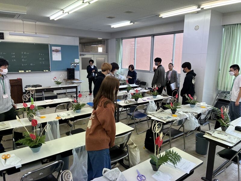 初めての生徒も多い中で、空間の使い方を工夫する生徒、花の形をそのまま生かす生徒、あえて変化を加える生徒など、それぞれの感性が光る作品が生まれました。